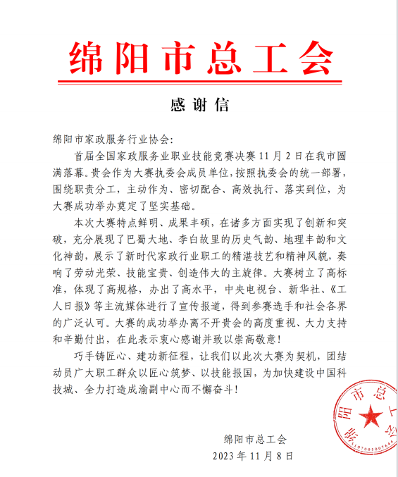 綿陽市家政服務行業(yè)協會力助首屆全國家政服務業(yè)技能競賽決賽在綿陽圓滿落幕,綿陽市總工會高度贊揚,綿陽市美新家政熱烈祝賀!